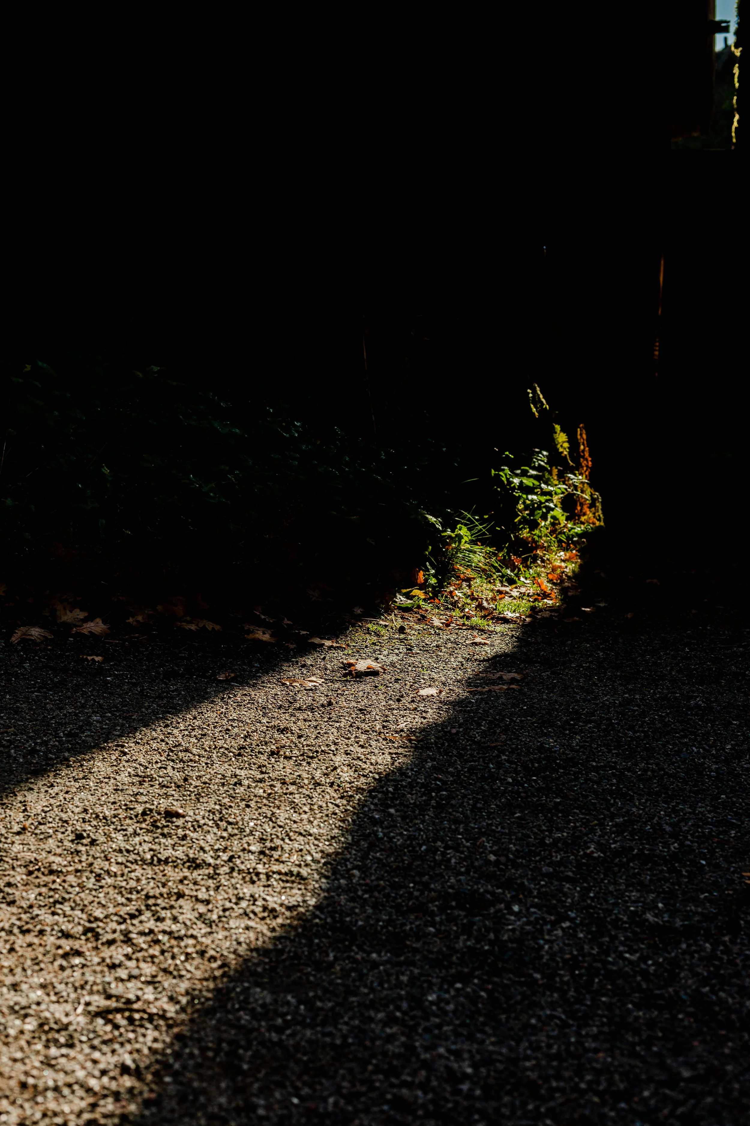 Rayon de soleil illuminant le sol et quelques plantes près d'une entrée sombre